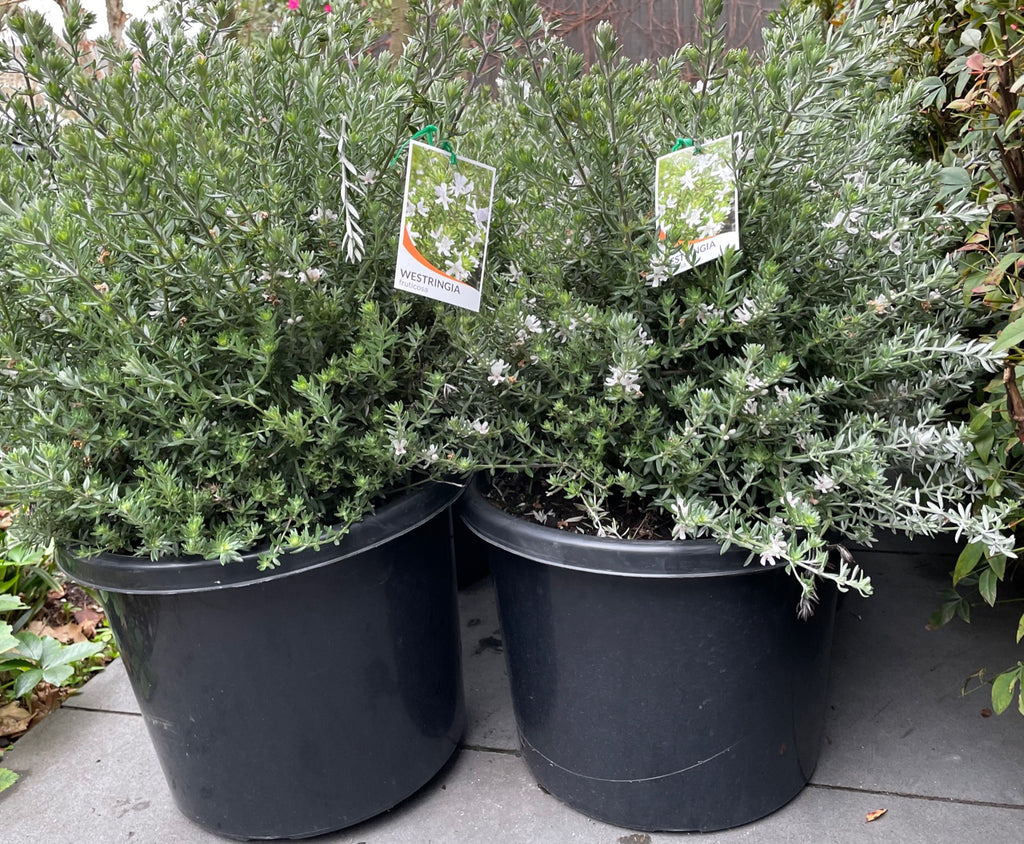 Westringia Fruticosa 'Coastal Rosemary' is a dense, evergreen Australian native shrub which is bushy and compact. It has crowded, grey-green, rosemary-like leaves that are velvety white beneath. It is fast growing and is excellent for establishing hedges. Flowers white to light mauve for most of the year. Use in tough, exposed sites. It is ideal for native display plantings, seaside gardens or as an informal hedge. It tolerates a wide range of soils and conditions. Grows best in well-drained soil in a sunny, open position. Thrives under coastal conditions, including salt laden winds. Prune after flowering to maintain compact growth. Benefits from Summer watering.