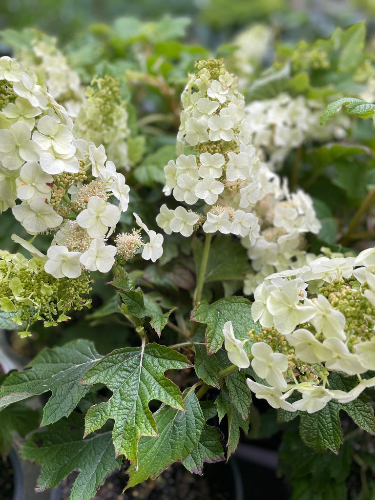 Hydrangea Quercifolia 'Prinsnow' is an Oakleaf Hydrangea.  It's a spectacular, small, deciduous shrub with large, gorgeous conical snow white flowers in Summer.  It's a stunning Summer and Autumn feature shrub.  It prefers a part shade to sunny position with a moist but well-draining soil.  To avoid flower and foliage damage aim for the base of the plant when watering.  Prune old stems soon after flowering to encourage strong flowering the following Summer.  Feed with Blood and Bone and keep moist during Summer.